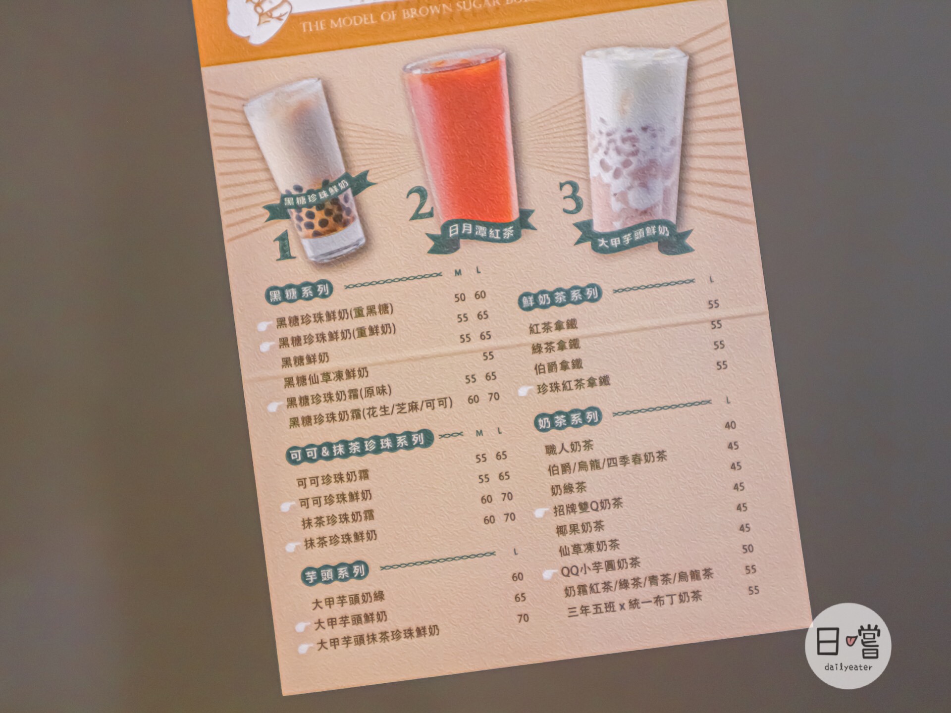 最後決定選擇大甲芋頭鮮奶($65)、黑糖珍珠鮮奶重鮮奶($65)跟抹茶珍珠奶霜($70)