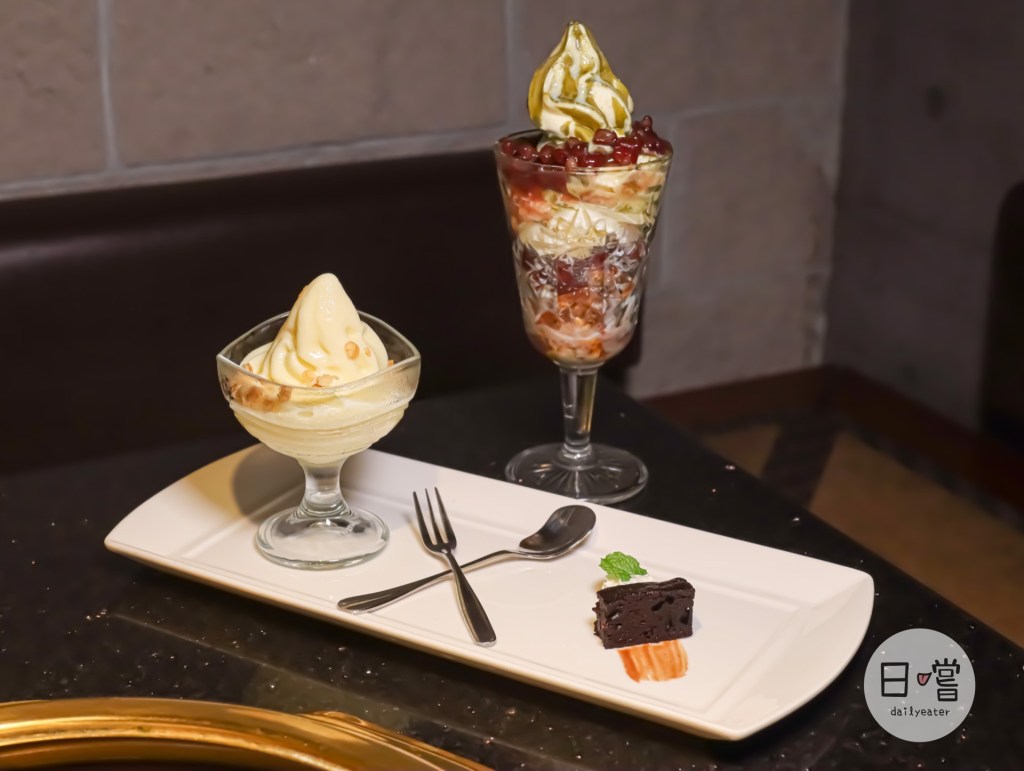 甜點的部分可以從布朗尼小聖代、紫米紅豆湯選擇三種