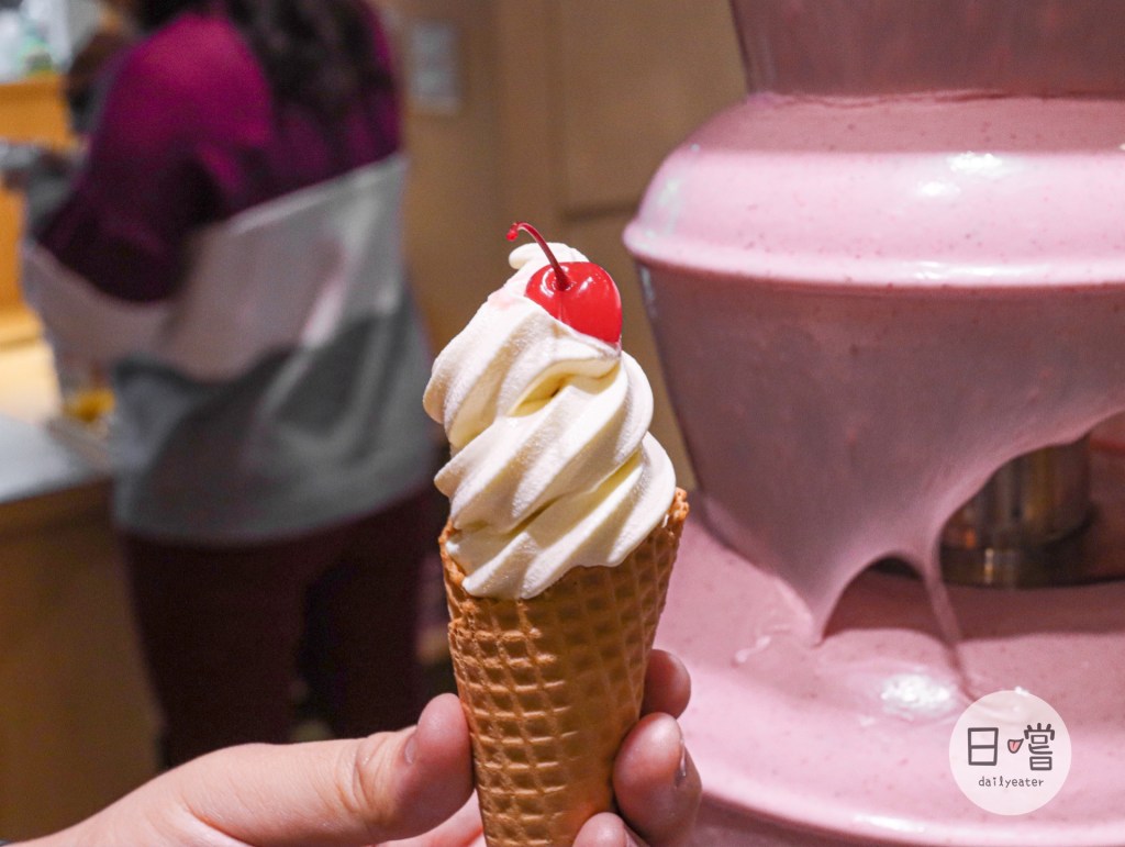 霜淇淋帶有濃濃的奶香,還滿好吃!還去鬆餅區拿了一個櫻桃來點綴😆