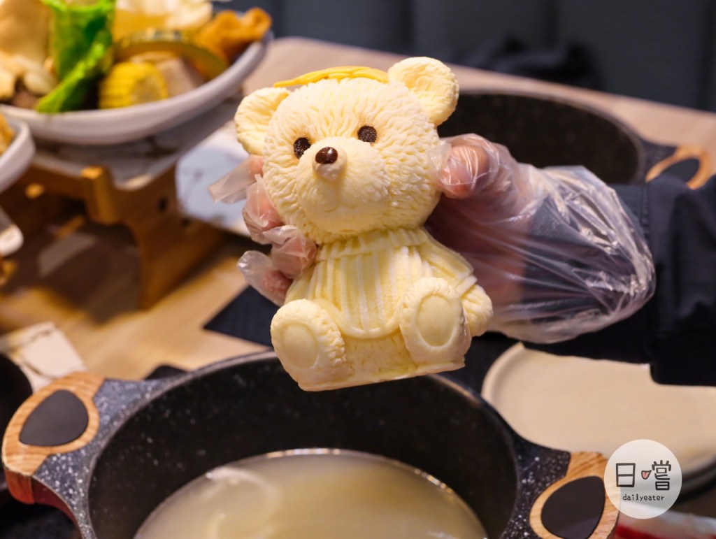 服務人員有提到星野熊建議在火鍋開始滾之後再放進去,但為了要拍到星野熊的泡湯感,先放進去拍一張😆