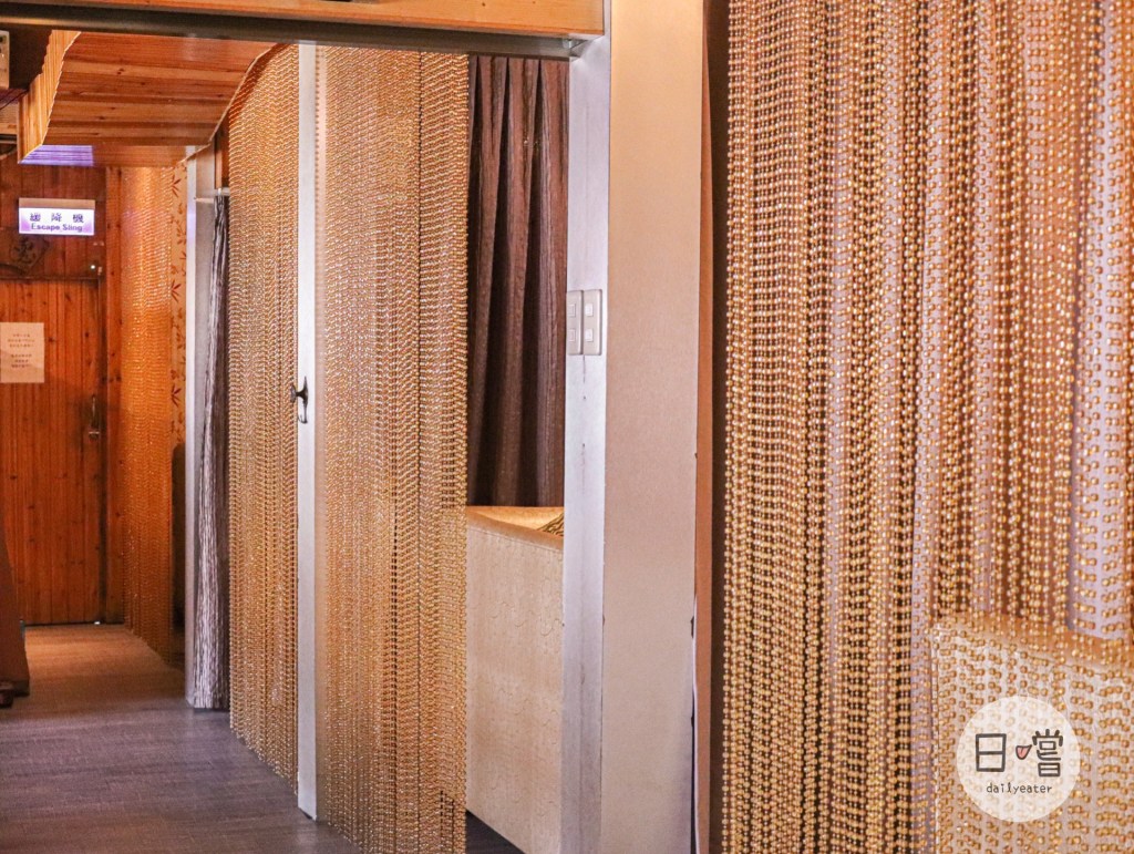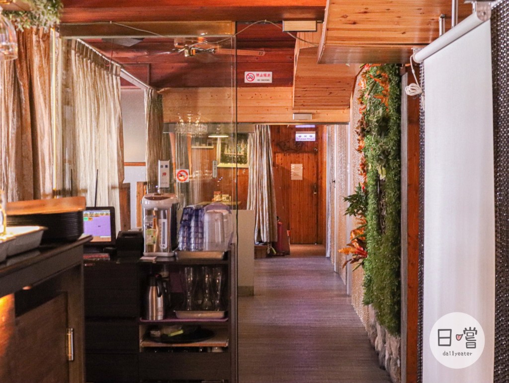 餐廳的長廊也有特別設計,使用一些綠牆跟門簾的方式,一方面作為座位區的隔間,另一方面也作為長廊的擺飾