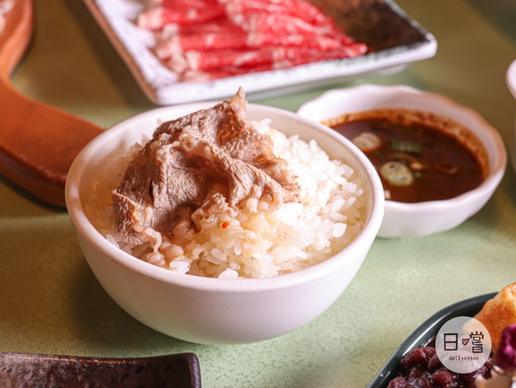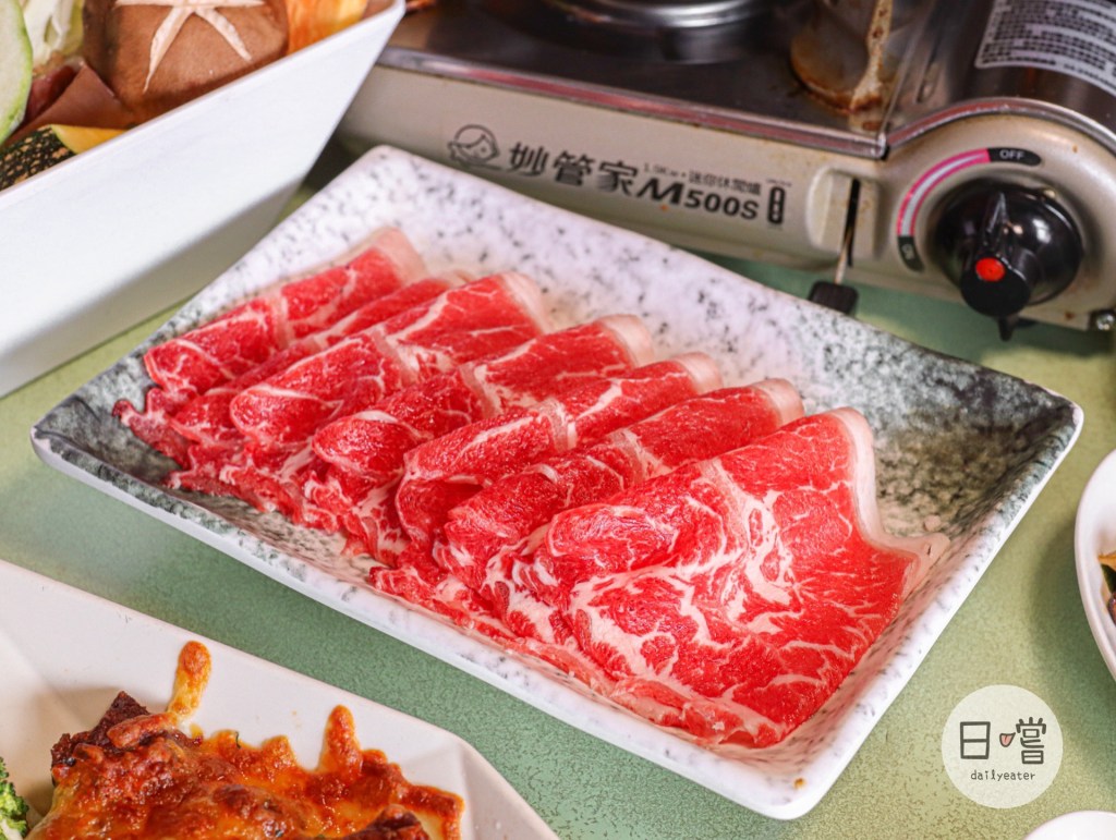 肉類的部分有梅花豬、板腱牛跟羊五花三種不同的肉類可以擇一。選的板腱牛油花分佈均勻,讓人不禁期待等等入鍋煮😋