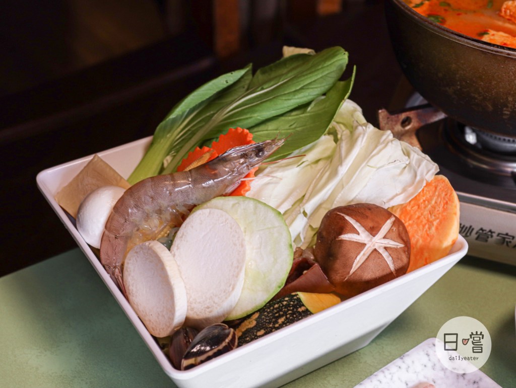 菜盤的部分也滿豐盛,除了基本的蔬菜、火鍋料外,還有一些蝦子跟蛤蜊等海鮮