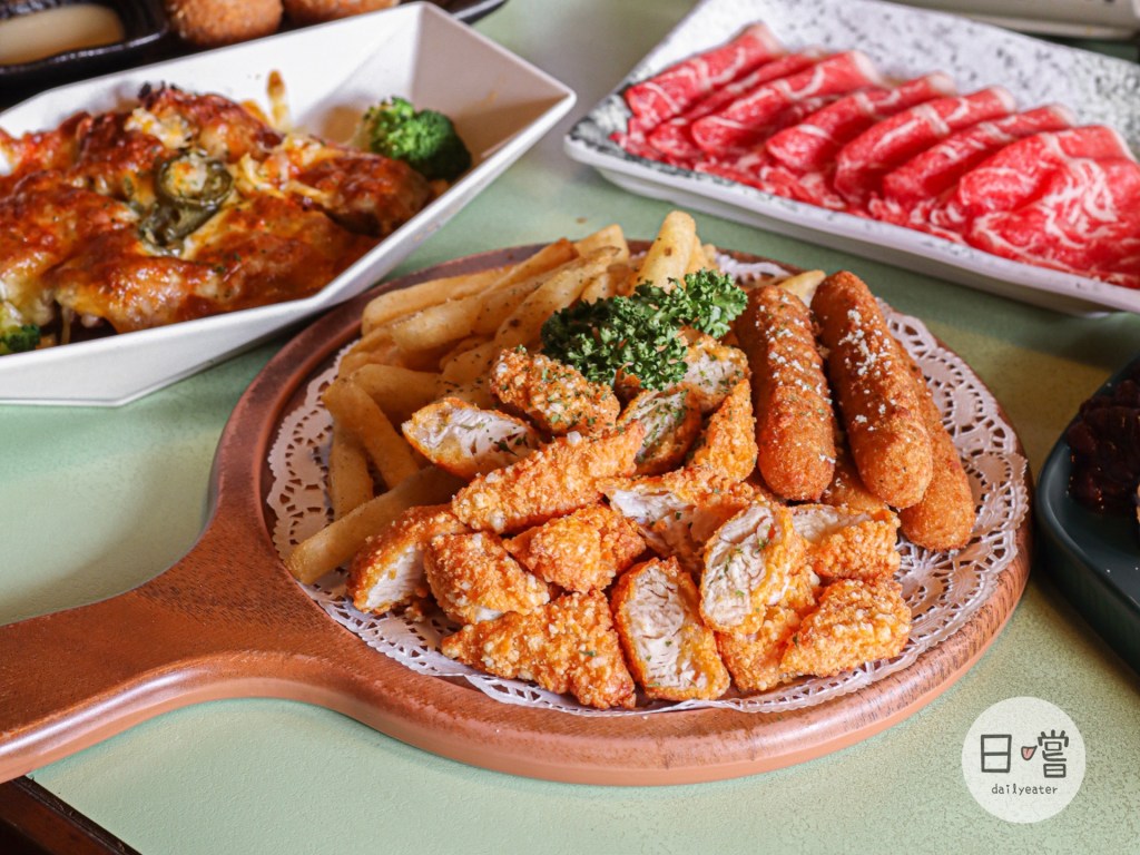 端陽邀月除了有飯食、丼飯、火鍋外,還有一些小點心及沙拉!特別點了這盤小拼盤($210),裡面有起司棒、雞柳條跟脆薯