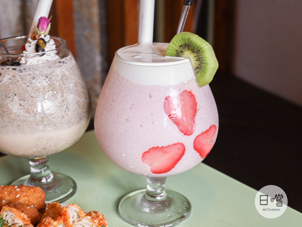 莓的嫑嫑果昔主要是由草莓、奇異果跟優格製成的果昔,同屬清爽健康類型的飲料!三片草莓片貼在杯子讓人少女心噴發🥰
