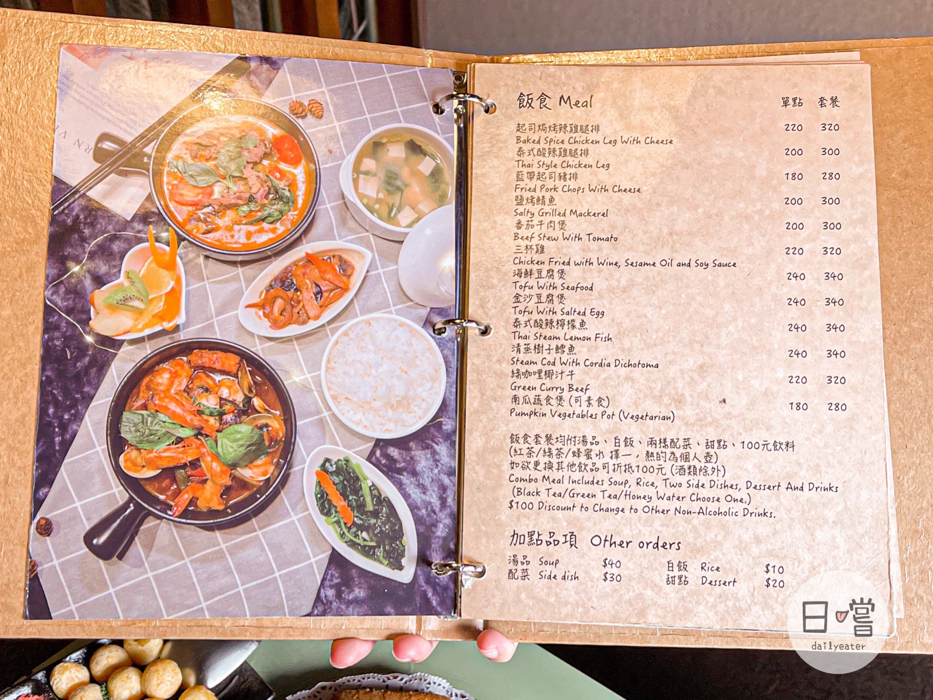 飯食類的部分除了主食外,還會附上白飯、湯品、兩樣配菜、甜點及100元的飲料(如果想要更換其他飲品可以折抵100元,但酒類除外)