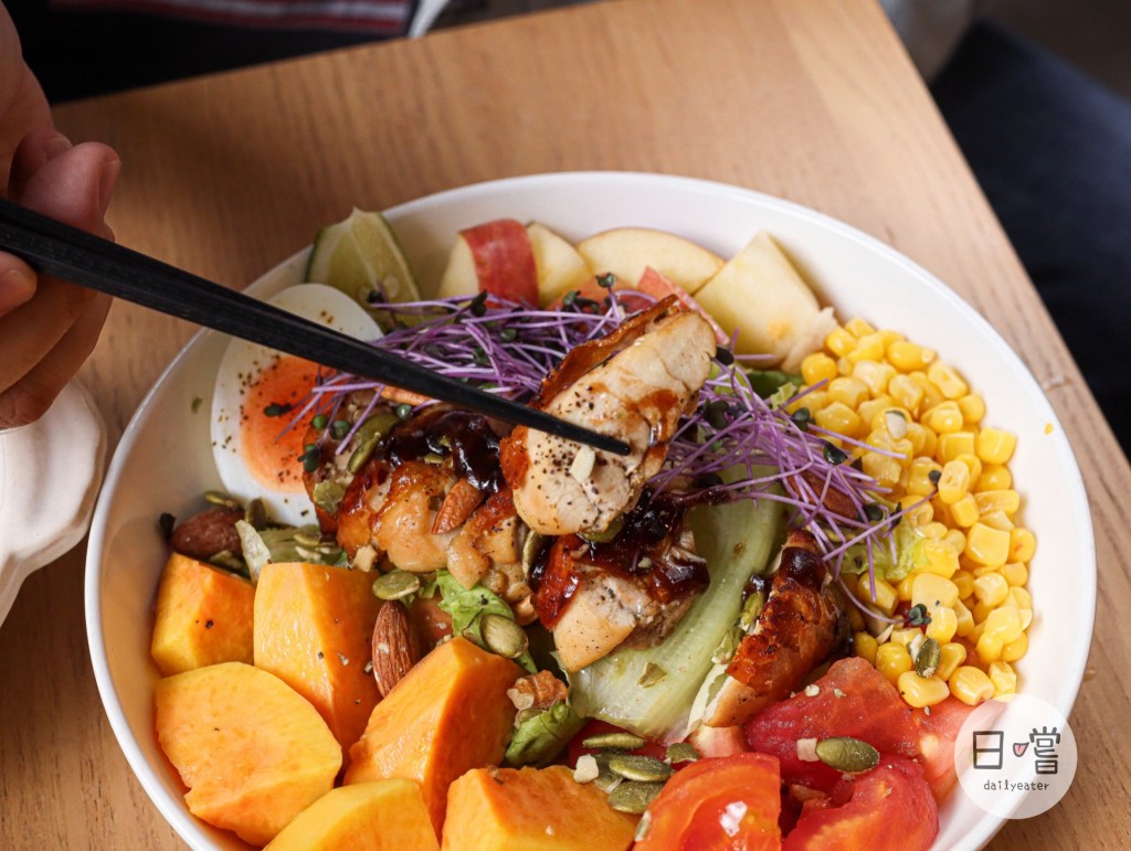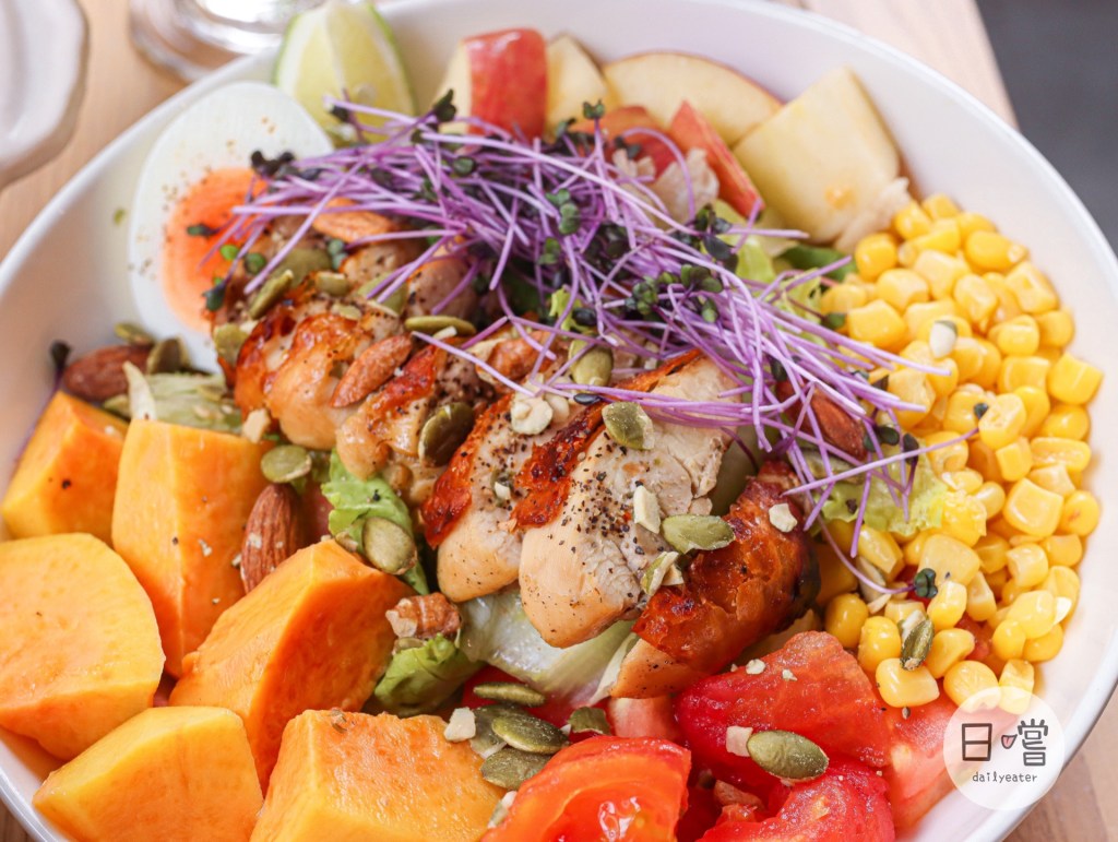 沙拉的部分有油醋醬、橄欖油與鹽巴兩種調味,除了滿滿的蔬菜上面還有香氣十足的烤雞😍
