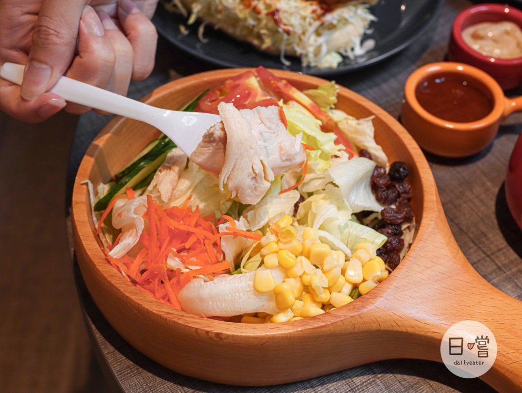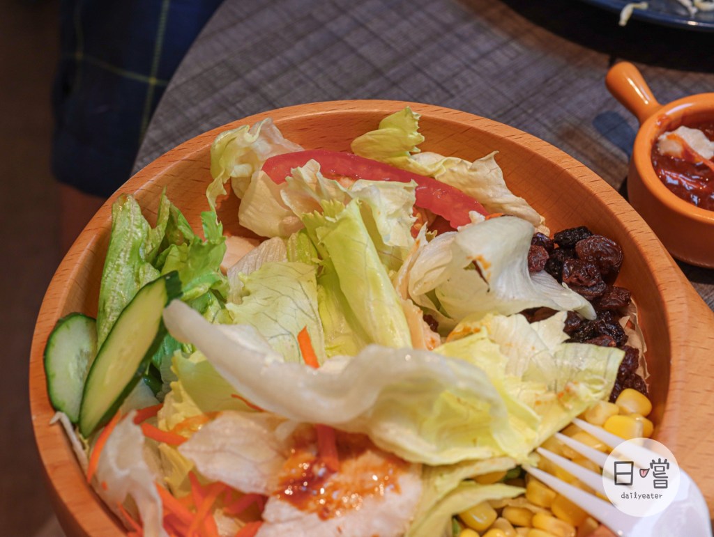 因為本身跟朋友也愛吃蔬菜的關係,看到他們家的沙拉份量感覺很適合兩人分食就點來嚐鮮😍裡面的蔬菜以生菜作為基底,還加了小黃瓜、紅蘿蔔、番茄、玉米跟葡萄乾