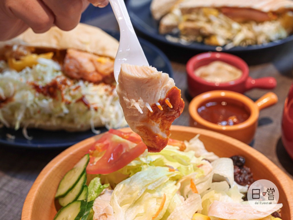 咬下去的時候感受到的是雞腿的鮮嫩感😋中間有起司做為襯托,把烤腿的醬汁鎖住很可以!而高麗菜絲在裡面讓整份餐點口感更加有層次,還滿加分😍
