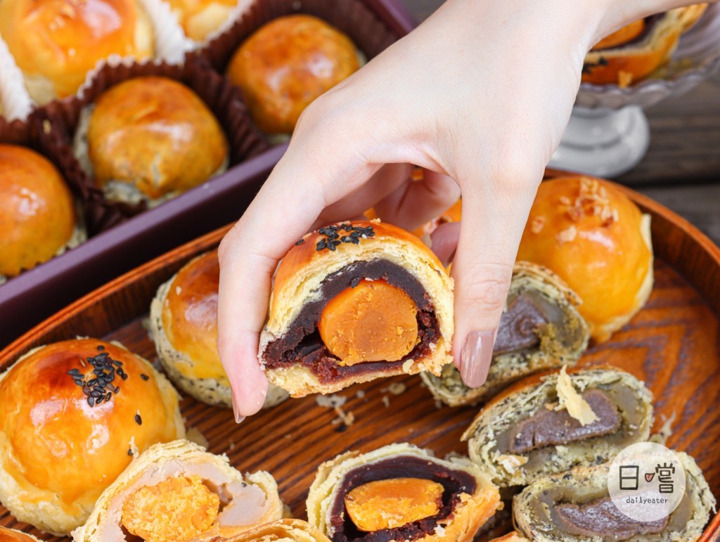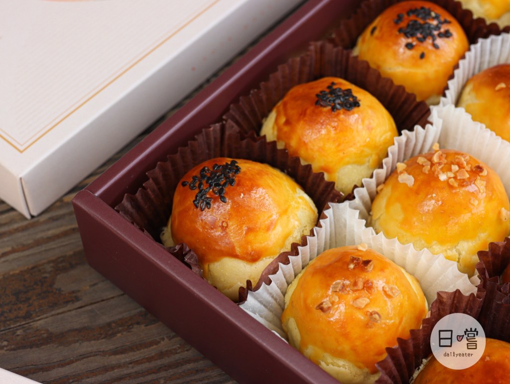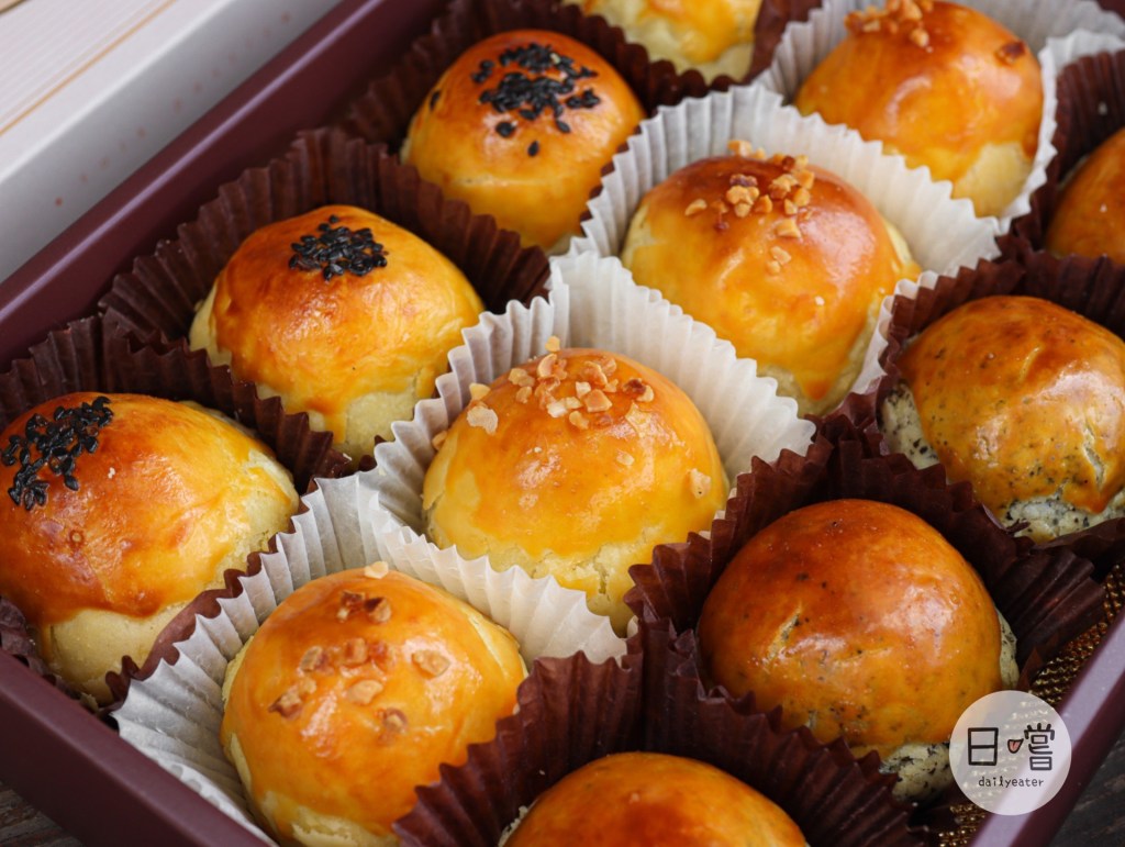 經典的紅豆蛋黃酥上面灑上黑芝麻,金黃色的外皮讓人超級有食慾🤤