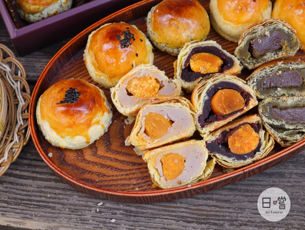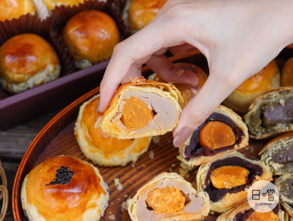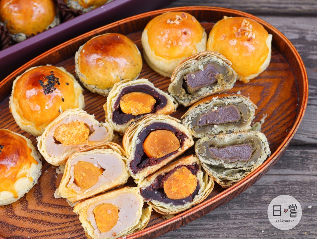 蛋黃酥本身的皮吃起來既酥又不油膩,上面的餅皮也不會掉的一塌糊塗!打破一般對蛋黃酥只有紅豆鹹蛋黃的印象,還有芋頭鹹蛋黃跟抹茶麻糬,不用怕單一口味很無聊