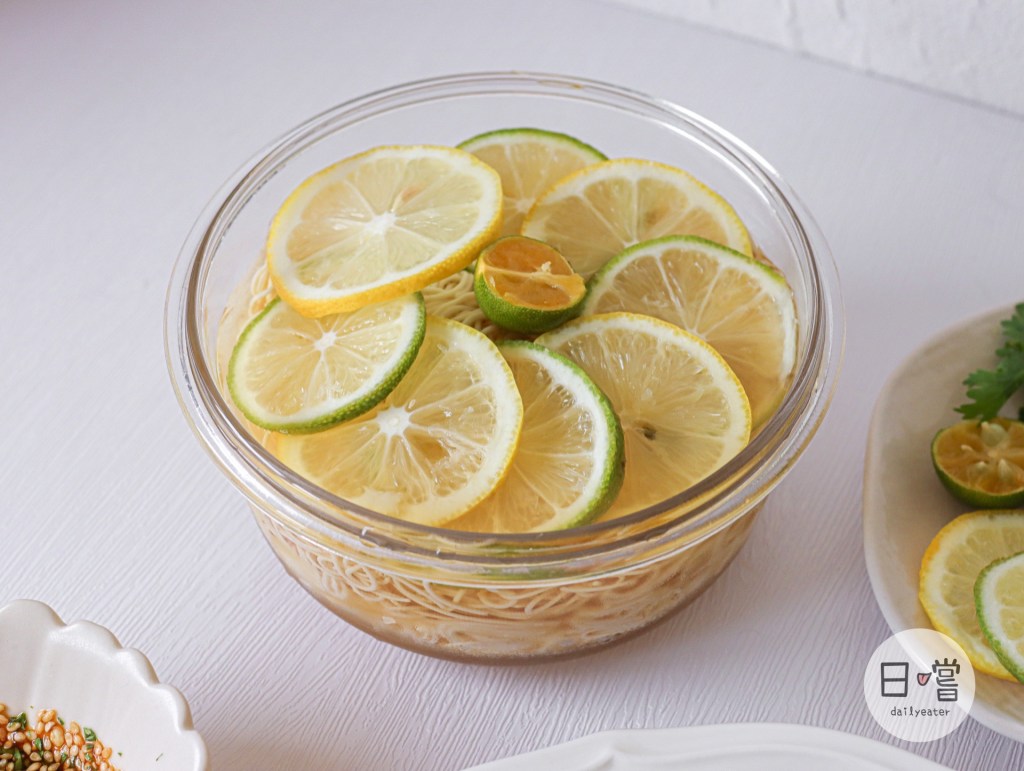 夏日青檸麵的準備食材就比較簡單!黃、綠檸檬切片以及半顆金桔