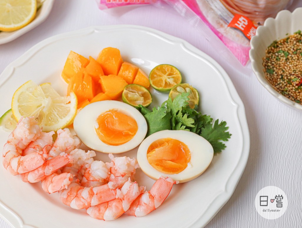 芒果鮮蝦麵主要的食材是芒果、鮮蝦、香菜、檸檬、金桔跟溏心蛋!