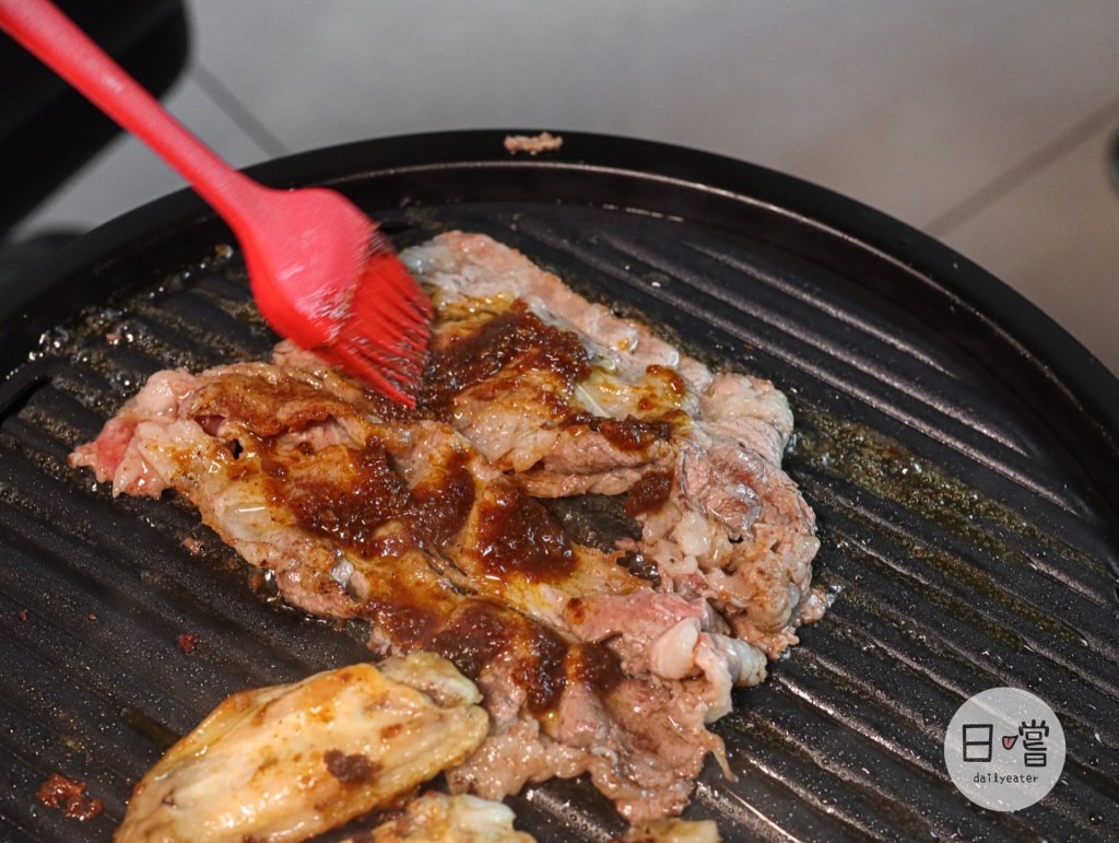 而燒肉的部分可以邊烤邊沾醬,燒肉的油脂在烤盤上吱吱作響後馬上塗上醬汁,整個香到不行😆誰說沙茶醬不能當烤肉醬,完完全全是可以當烤肉醬使用!