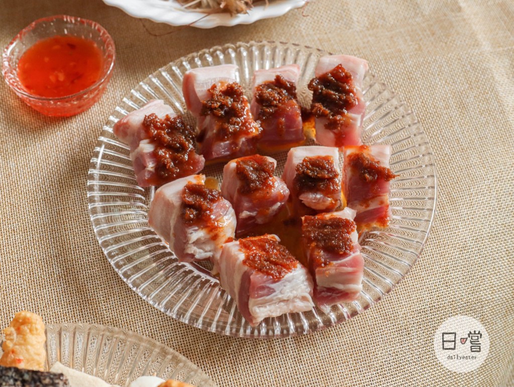 這次要做的蔬菜三層肉串,三層肉在裡面扮演著一個很重要的角色!它也是我選擇要醃肉的其中一項肉品之一!為了要拍照好看,特別把沙茶醬抹在三層肉的最上面。如果是正常醃肉時,可以根據自己的洗好,加入沙茶醬外還可以再加入醬油、糖等,讓每一面都可以均勻吸收到😋