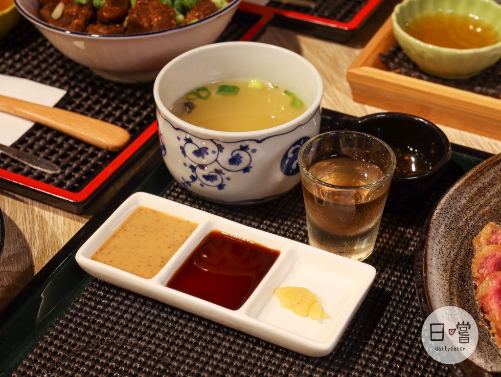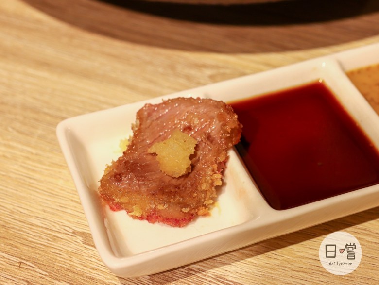 沾醬分成胡麻沾醬、日式醬油及蒜泥三種,建議先吃單純的炸牛排,體會那原汁原味🤤濃郁的胡麻醬、清爽的日式醬油或是贈添風味的蒜泥也都各自有特色!可以依照自己喜好做調味
