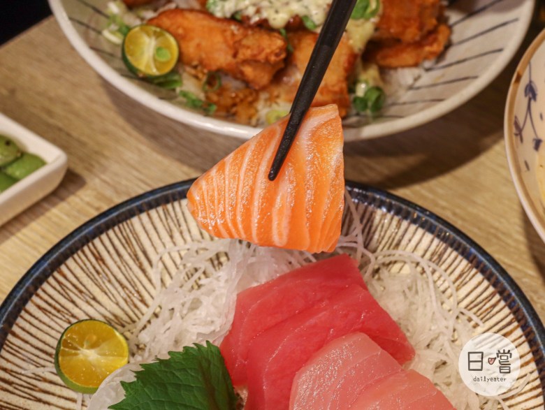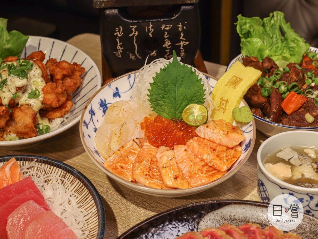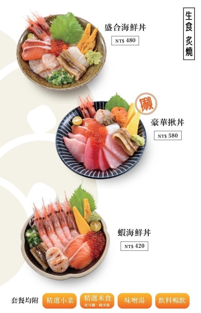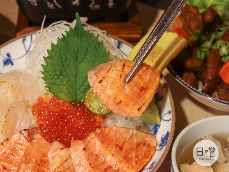 他們家生食類的丼飯種類還滿多,如果平常喜歡吃熟食的話,也有炙燒的海鮮丼可以選擇!像這次選的炙燒鮭魚干貝丼,裡面的鮭魚、跟干貝都是炙燒過,所以完全不用擔心生食的問題👌