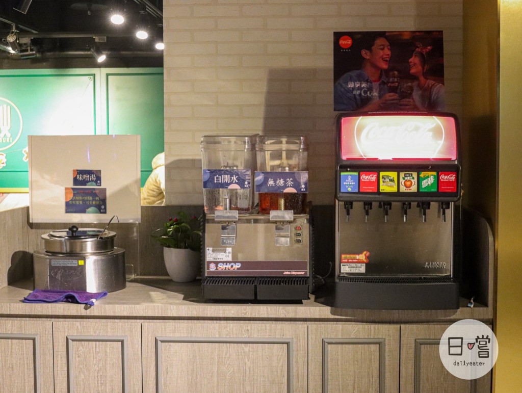 在店內中間也有提供飲料、湯品的自助吧服務!在店內點餐點都會附上湯品,如果想續直接續就好!飲料也有提供一些汽水、茶跟一般開水,品項也滿多元!