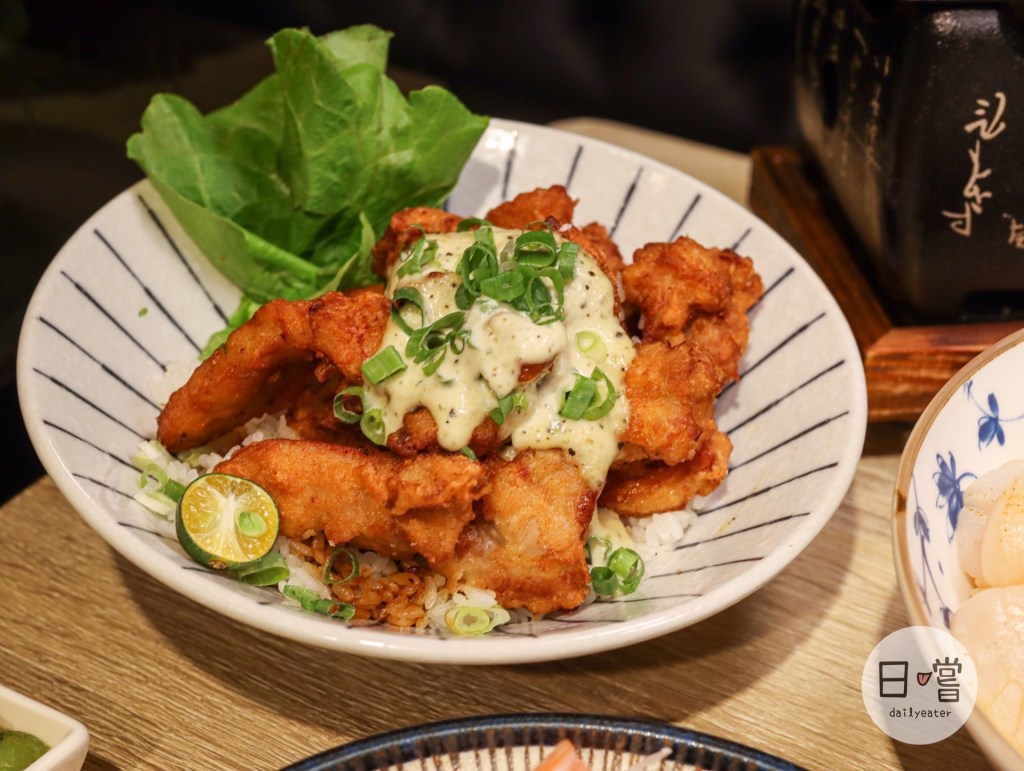 唐揚炸雞丼的部分,可以看到滿滿的炸雞山在飯上,中間還有沾醬可以配著吃!酥酥脆脆的金黃色外皮看起來就誘人,單吃雞肉有點乾,建議沾醬吃更好~這道滿適合一些學生族群😍兩百元就可以同時吃到唐揚肉肉山還有湯品、飲料無限續的服務
