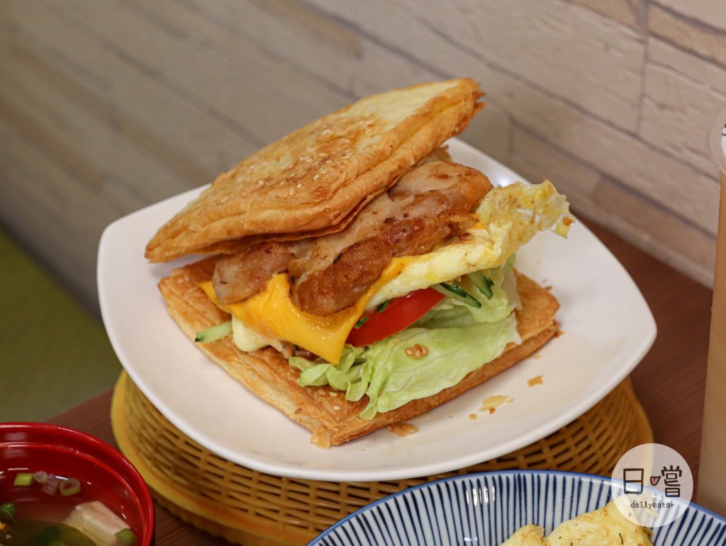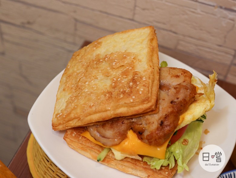 這款香頌是外面早餐店看不到的,要點當然就要點最特別!相較於一般的吐司、漢堡,弘爺漢堡的香頌系列是以正方形的可頌作為上下層,包入了厚厚的生菜跟雞腿🤤如果想吃起司或是蛋,也可以用加點的方式客製化出屬於自己喜歡的香頌