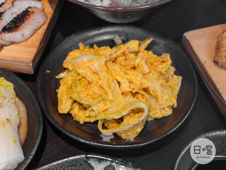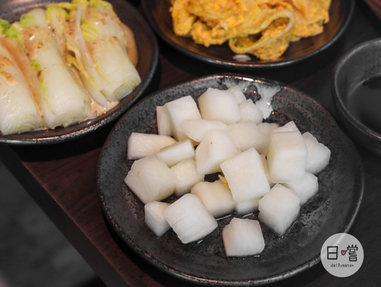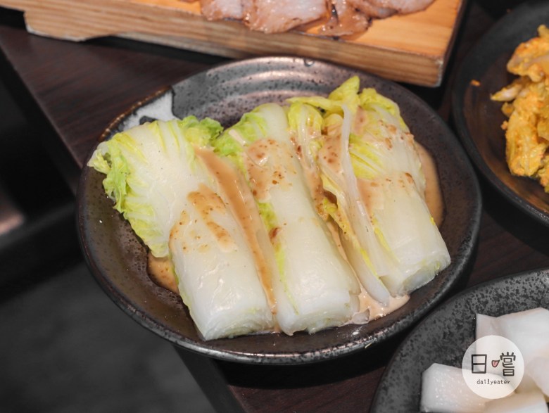 三款小菜都是屬於清爽系,白蘿蔔咬下去清脆的口感還帶有柚香😋偏台式的黃金泡菜每一口都讓人覺得清爽又解膩!而他們家的青菜用胡麻醬淋上去,相較於一般青菜來說甜而帶點微鹹的醬汁吃起來更顯得青菜的甜🥰