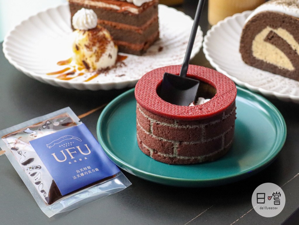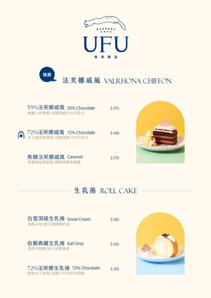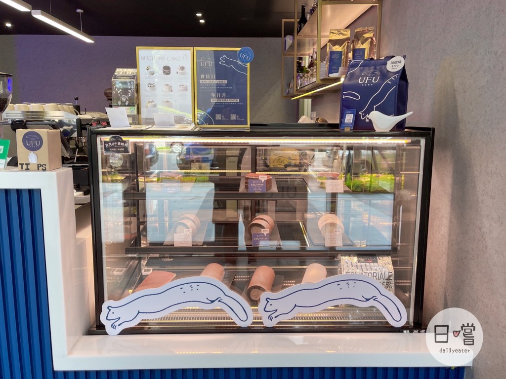 製作甜點的區域也屬於開放式廚房,光是從玻璃櫃上看到UFU烏芙甜品的招牌甜點,戚風蛋糕跟生乳捲,每一款口味都好想來一片😋如果是當地人,或是來到青埔逛逛的人有經過,這邊也有提供完整的甜點可以外帶!(但整份甜點盡量還是網路購買以免到現場才發現沒有)