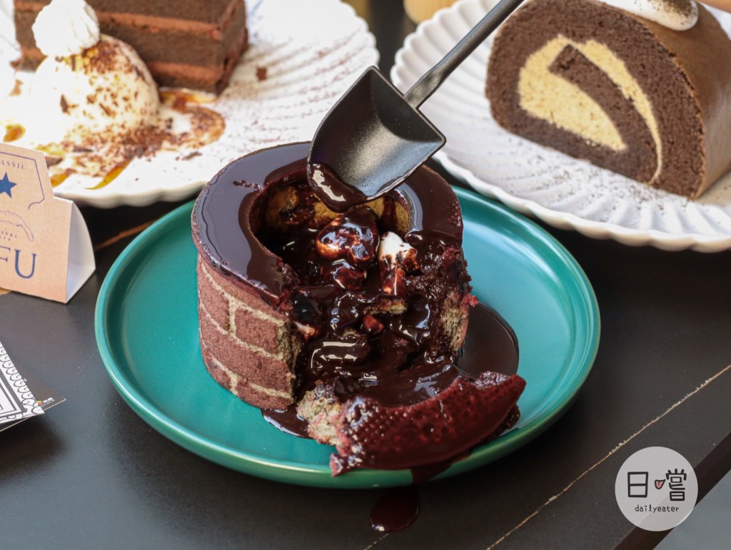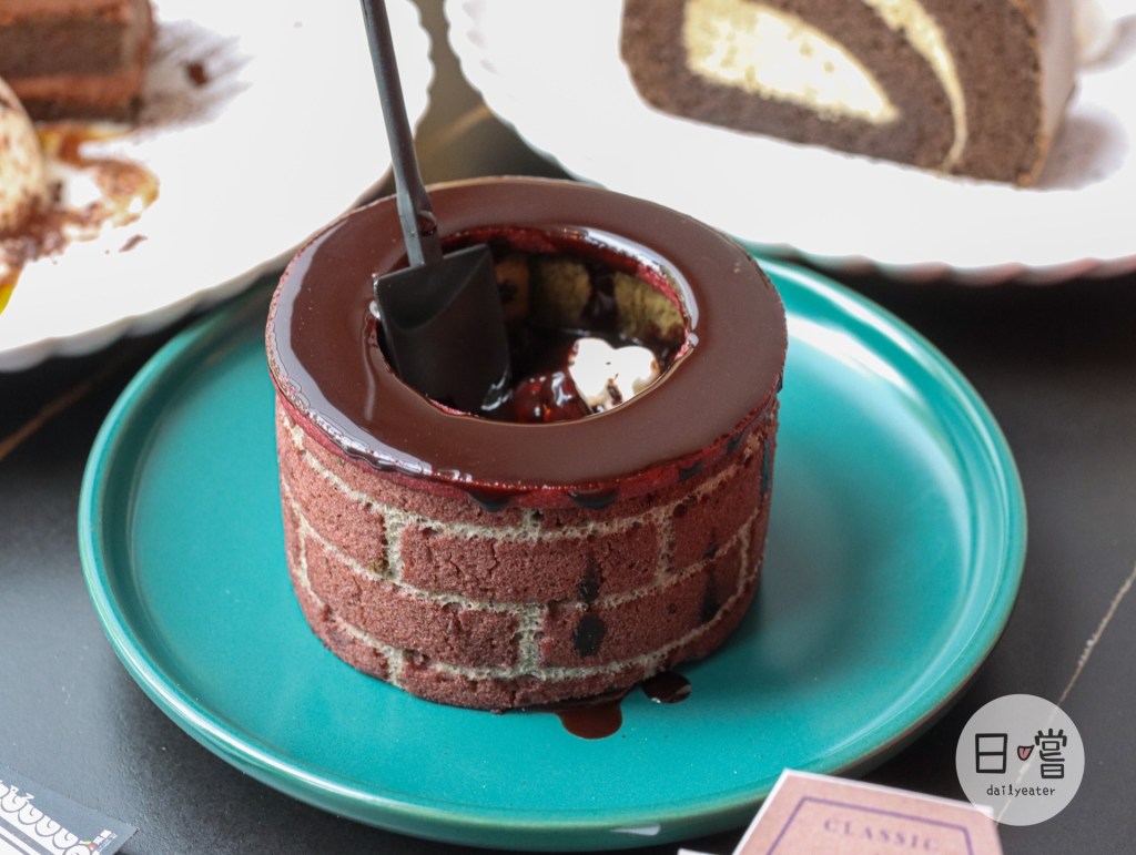 綿密柔軟的蛋糕體入口帶有淡淡的伯爵茶香,上面的巧克力餅乾與蛋糕的口感形成一個反差,吃起來是口感很有層次🤤挖開古井裡面的巧克力醬流到不行,苦甜的滋味與戚風蛋糕吃起來的甜度還滿剛好👌