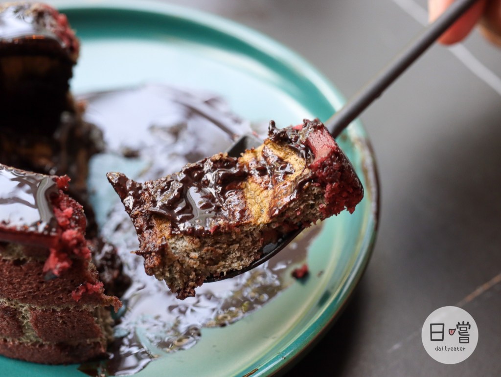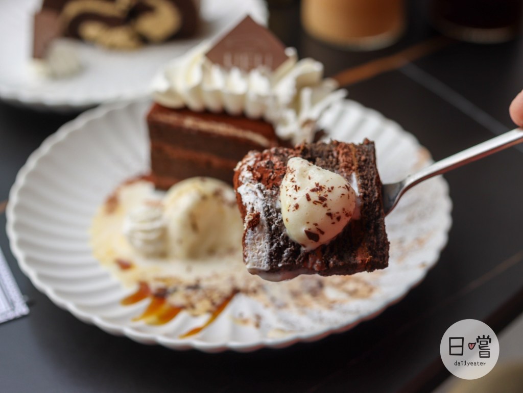 吃到一半時加了法芙娜巧克力醬,整塊蛋糕能吃到更多巧克力的香氣!不過這款巧克力醬吃起來有更多的甜感,如果不愛吃甜的人不用淋醬或是淋一點醬就滿剛好的👌