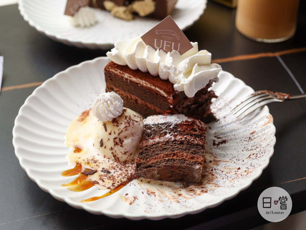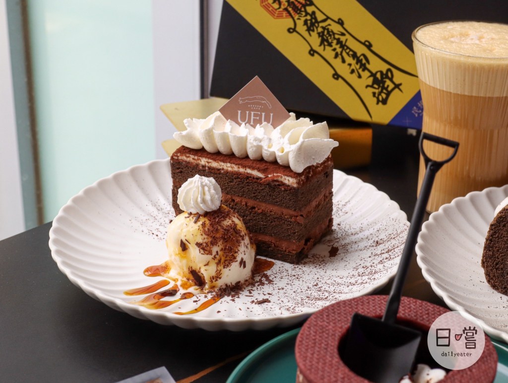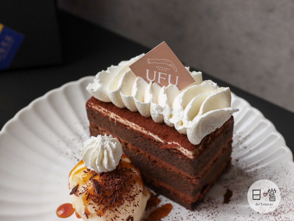 而他們家的法芙娜戚風則有焦糖、55%跟72%的口味可以選擇。個人滿推薦可以在烏芙內用的,在享用生乳捲跟法芙娜戚風的時候,除了甜點本身也都會做一些點綴,像是這道72%法芙娜戚風就有一球冰淇淋😋