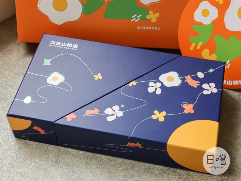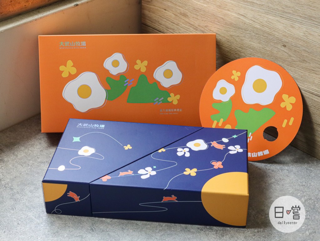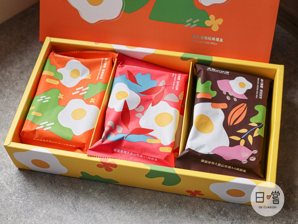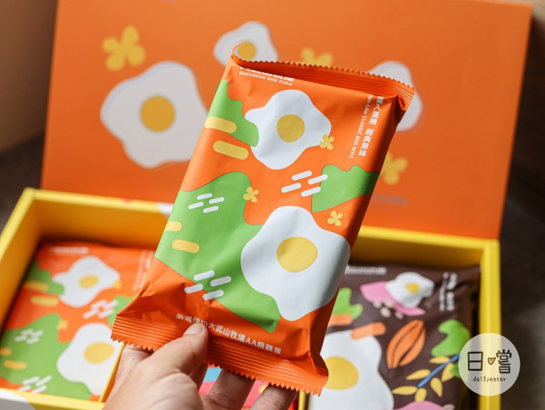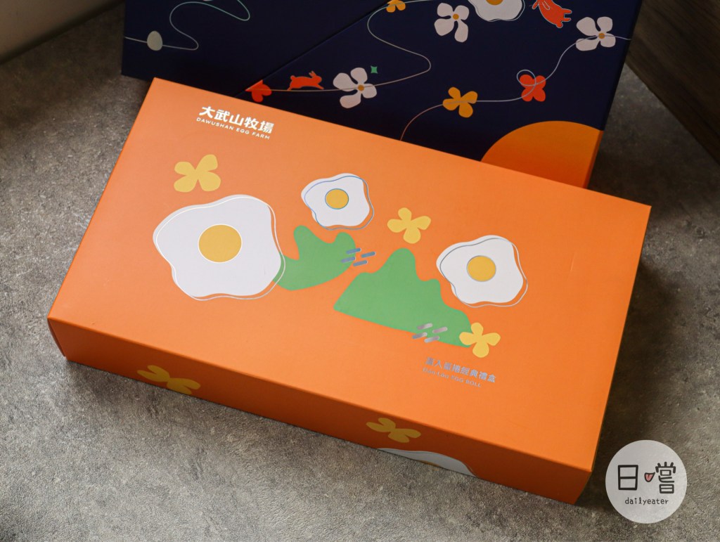 這次選的禮盒都是打破那種紅色底中帶有蛋捲照片的中式風格!像是這款蛋入蛋捲的經典禮盒,以橘黃色系的外包裝,上面還有大武山、雞蛋花還有可愛的荷包蛋😍