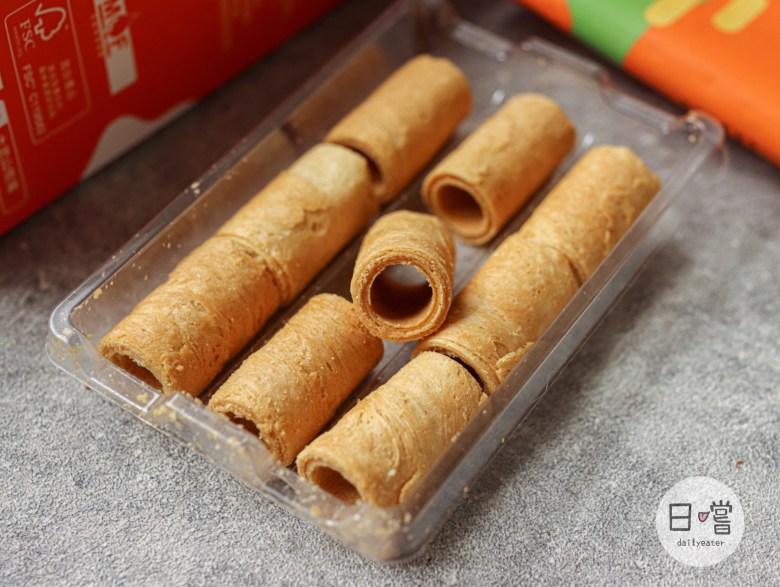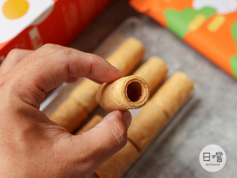 打開蛋捲的包裝後,才發現原來他們家的蛋捲不是一長條,而是長條形的蛋捲分成三等份,變成一口蛋捲的形式!即使碰撞到也不怕蛋捲會碎得四分五裂外,更重要的是在吃蛋捲時不用小心翼翼地吃,而是可以放心的一口吃😋