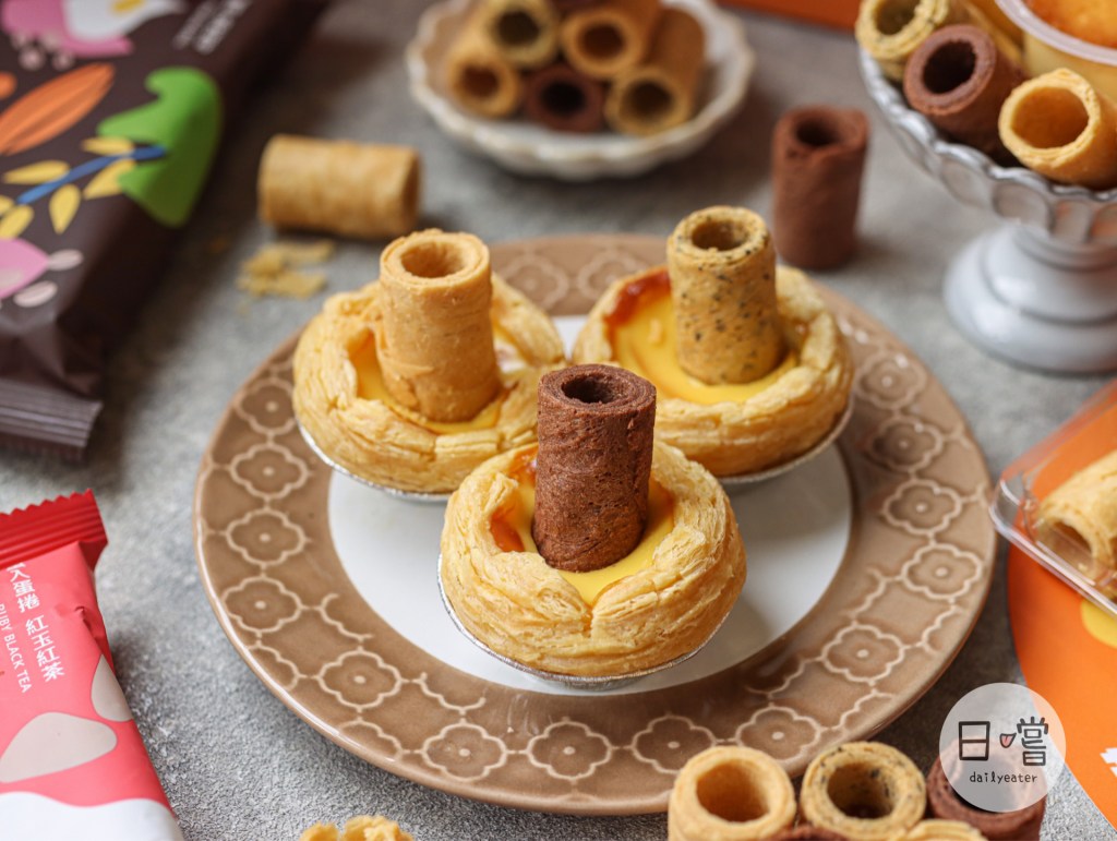 因為蛋入蛋捲是一口蛋捲的關係,如果覺得單吃蛋捲無聊的話,還可以變化出不同的吃法!像是可以放在布丁、蛋塔上,當心血來潮想弄份精緻的下午茶點心、又或者是客人來的時候,在點心上做點不同的小巧思,就可以呈現出不同的樣貌跟滋味🥰
