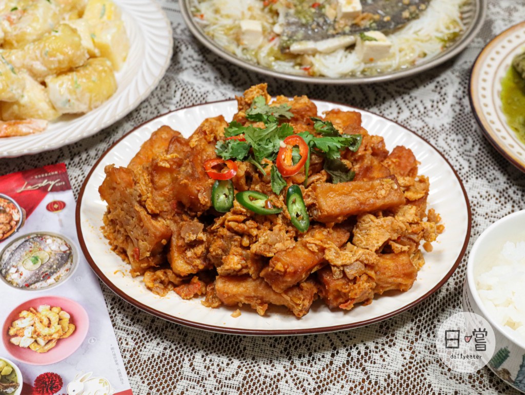 還記得前面有說綠咖哩跟紅咖哩都有在這次的年菜中嗎?Lady nara把紅咖哩跟象徵好彩頭的蘿蔔糕結合,變成一道結合泰式跟台式的「紅咖哩蘿蔔糕」