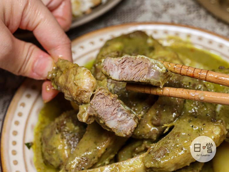 綠咖哩跟羊小排結合的「羊眉兔氣歲歲安」來迎接兔年,好喜歡他們替每道菜都這麼用心的取名😆誠意滿滿的六隻帶骨羊小排,拿起兩隻拍照頗有戰斧羊排的感覺😂一打開蓋子就聞到濃郁的綠咖哩香,在羊排旁的則是燉煮入味的馬鈴薯。