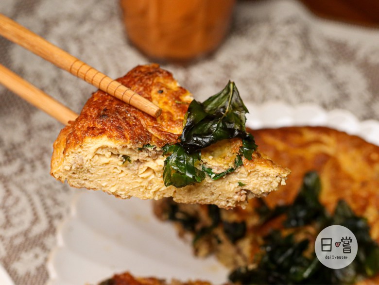 相較於印象中那蓬鬆口感的烘蛋,這道打拋豬烘蛋是比較紮實的口感!咬下去除了有蛋香外,還有打拋豬那鹹香的味道在嘴裡蔓延,一口烘蛋一口白飯,就好像吃到外面的打拋豬飯一樣,但用這麼創新的料理方式真的是第一次見到呢!