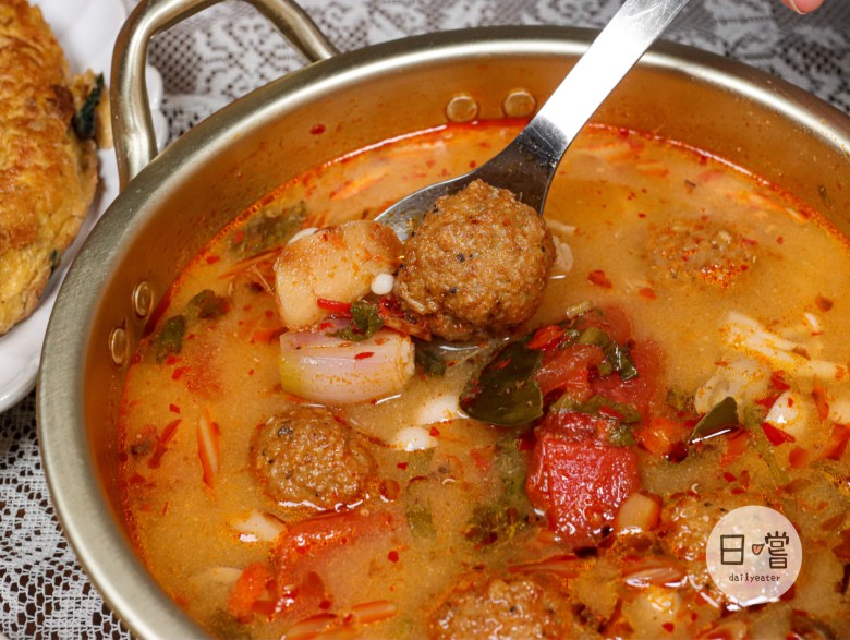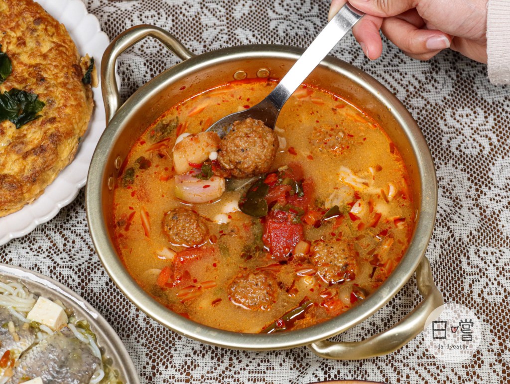 橘紅色的湯頭隨便一撈都有滿滿的辛香料,香茅、檸檬葉、南薑外,裡面還有菇類、番茄等配料,還有六顆豬肉丸子。那冬蔭功獨有的酸跟辣,一喝進去馬上可以刺激味蕾😋