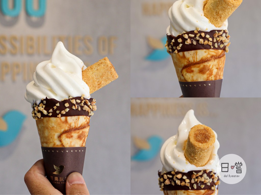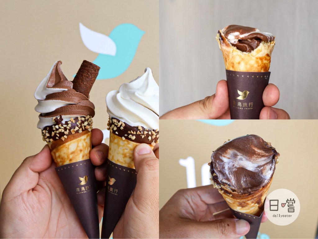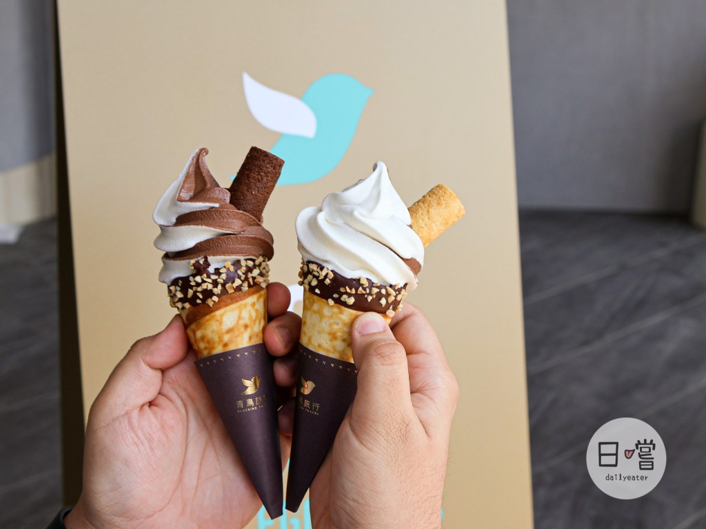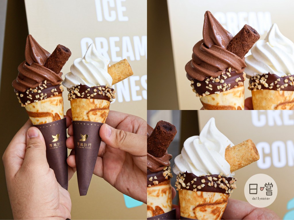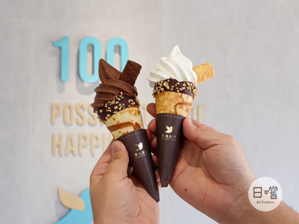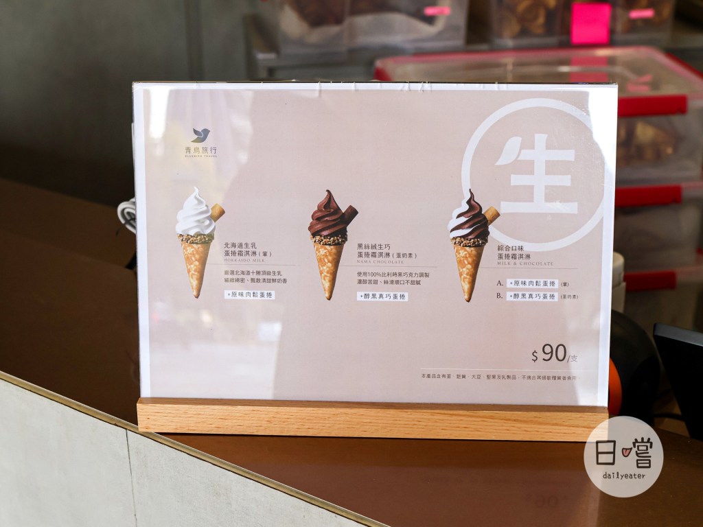 店面總共有黑絲絨生巧、北海道生乳跟兩種Mix在一起的綜合口味可以選擇。滿特別的是每隻冰淇淋上都會有跟青鳥旅行的蛋捲,黑絲絨生巧搭配醇黑真巧蛋捲、北海道生乳口味搭配原味肉鬆蛋捲,而Mix版的霜淇淋則可以兩種口味任選