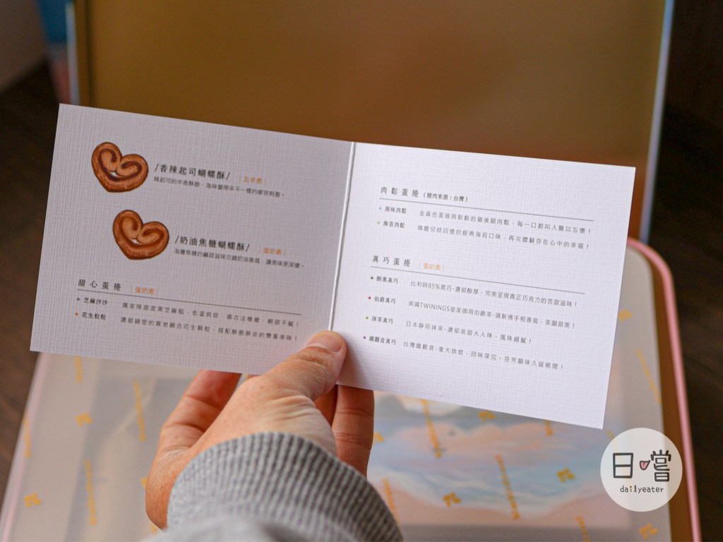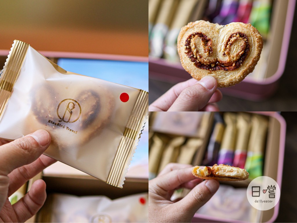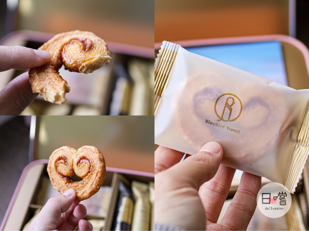 旁邊的愛情海洋綜合餅乾禮盒裡面有八種口味的蛋捲各兩隻外,還有新推出的蝴蝶酥!有香辣起司跟奶油焦糖兩種口味,對於身為青鳥旅行老粉來說,肯定要試試看的吧😎