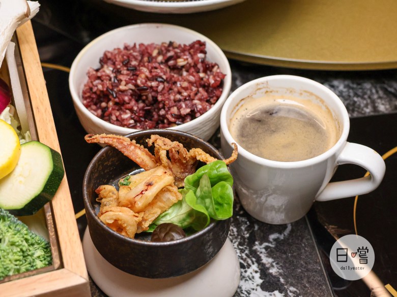 小菜部分在一開始的時候就可以選擇海、陸、蔬三擇一,這次提供的是炸魷魚,酥酥脆脆沒有油耗味,搭配蔬菜吃也不會有油膩的感覺