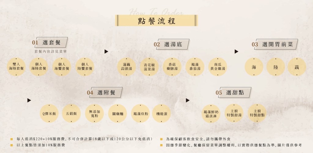 店內套餐主要分成平日午餐跟平日晚餐、假日,這次點的是晚餐的火鍋套餐,先選套餐、再依序選擇湯底、開胃菜、副餐跟甜點