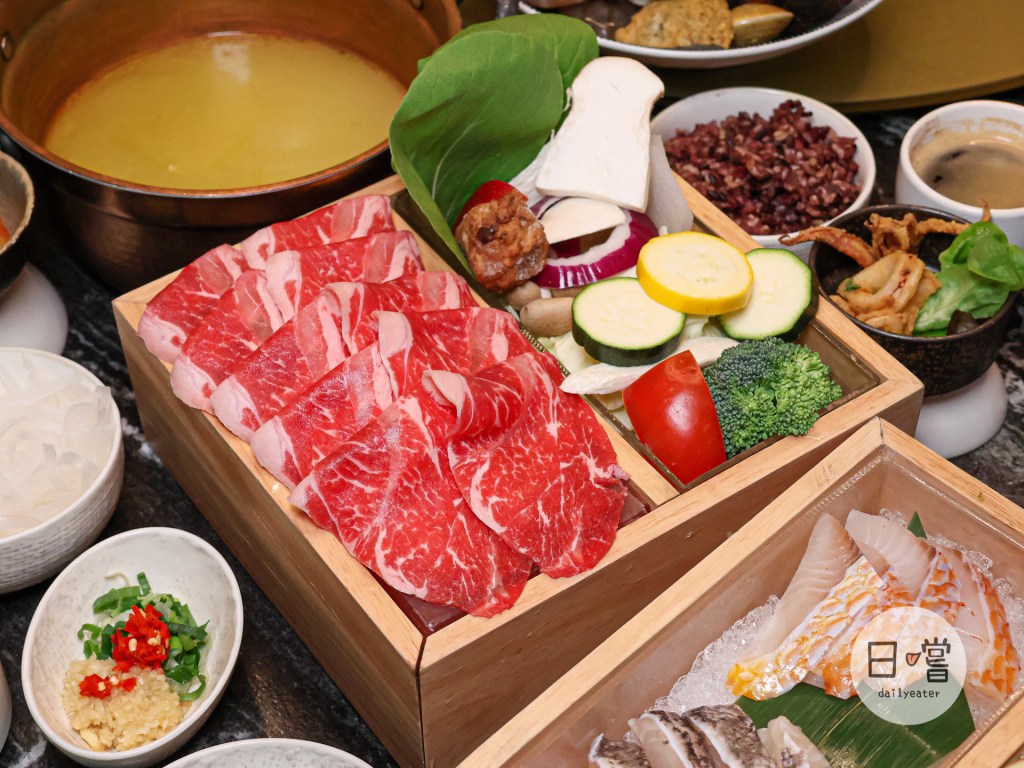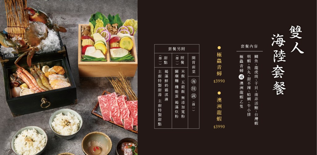 點的陸饗套餐有頂級小羔羊、伊比利黑豬跟PRIME霜降牛三種肉品可以選擇,套餐內除了有肉外也會提供干貝、台灣蝦、魚丸、甜不辣跟蛤蜊