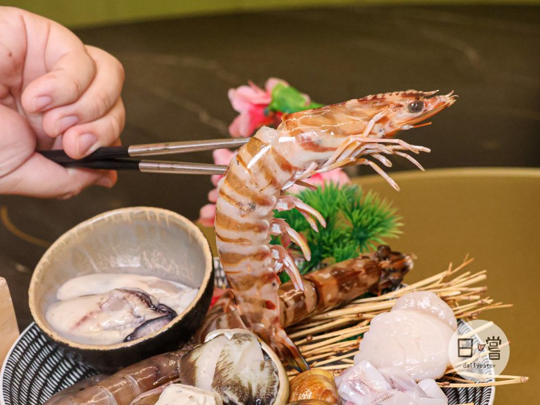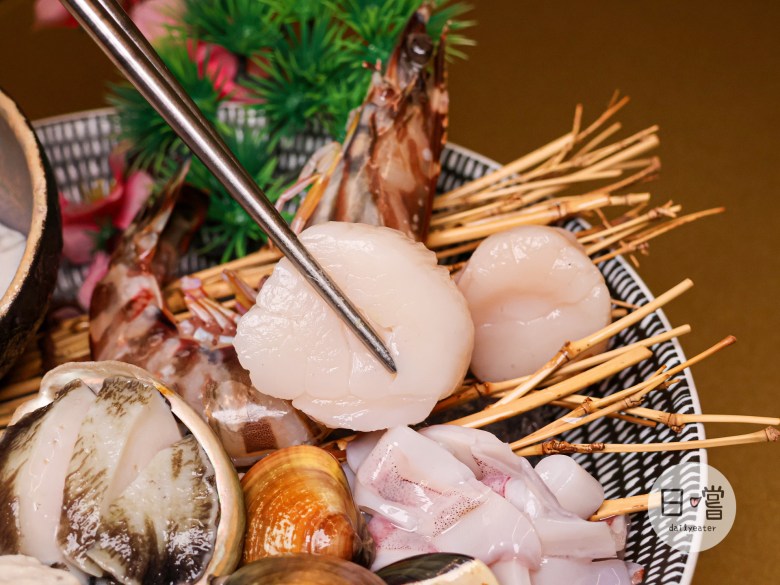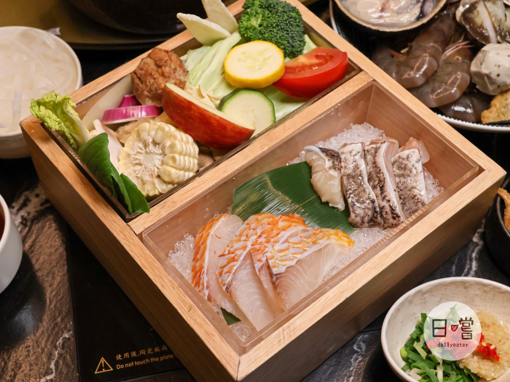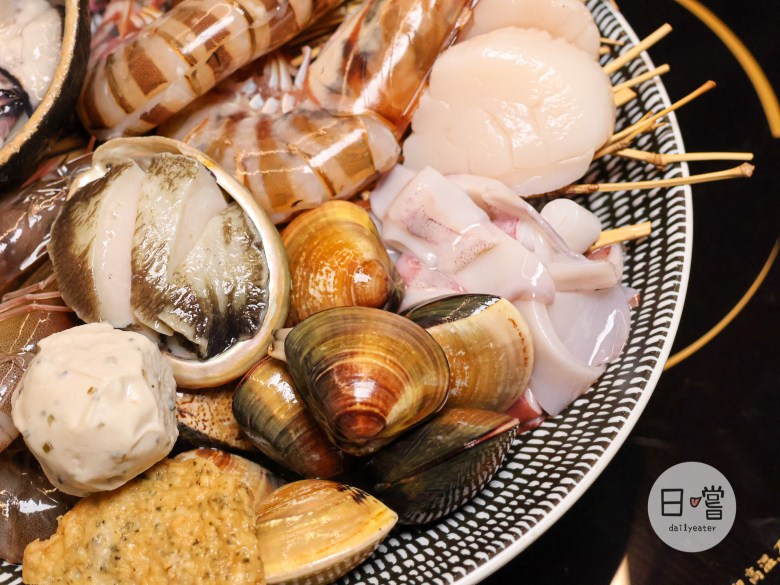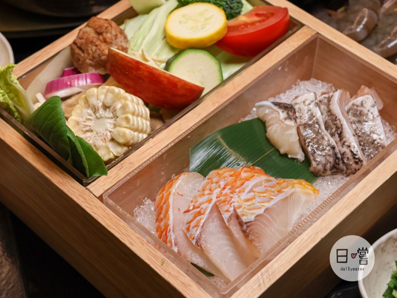 搭配個人海饗套餐的御品海鮮裡面有11種不同的海鮮,像是鯛魚、龍虎斑、干貝、台灣蝦、明蝦、南非活鮑、廣島生蠔、中卷跟蛤蜊,還有魚丸跟甜不辣