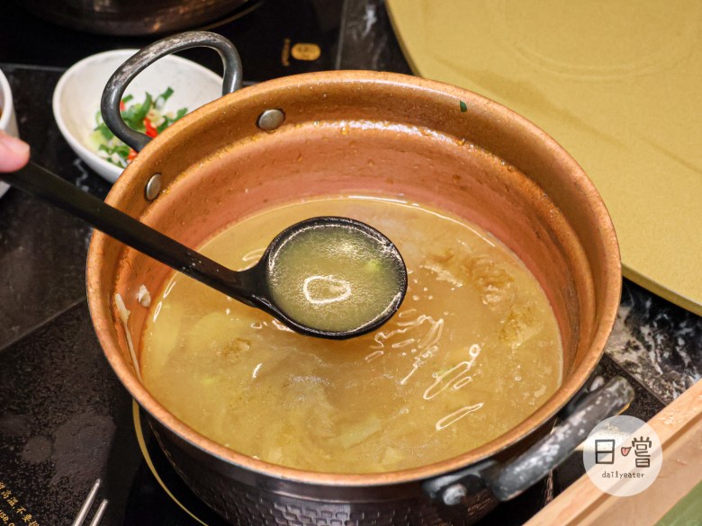 朋友選的南瓜黃金雞湯屬於顧脾的湯頭,金黃色的湯底入口帶有淡淡南瓜香,跟青花椒菠菜湯一樣喝起來都沒有負擔!如果本身是不喜歡有過多調味,想喝到單純湯頭的滋味的話滿推薦這款👌