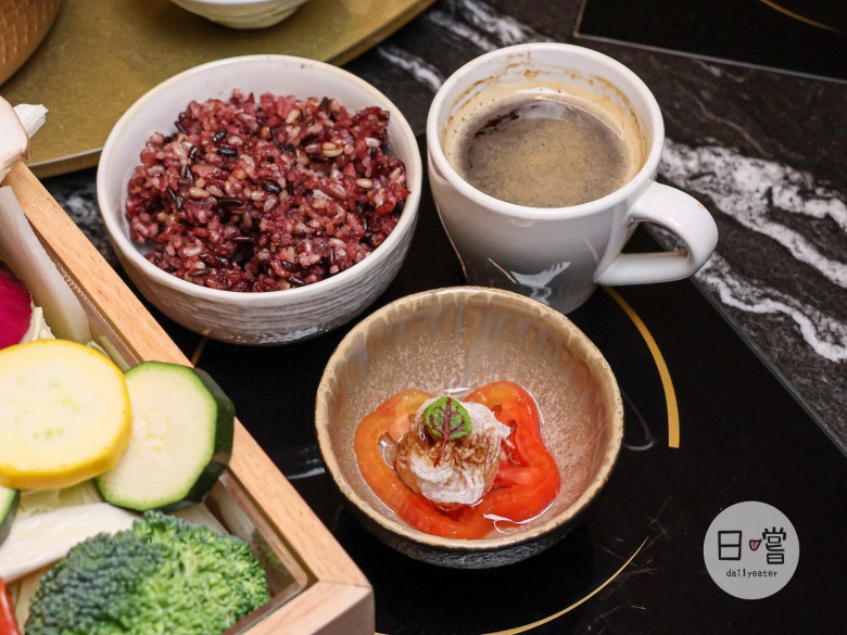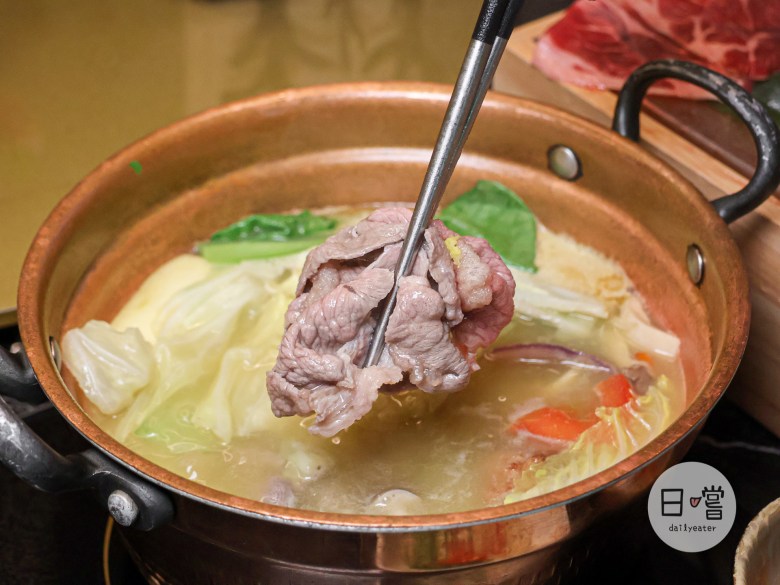 一上桌看到美國特優PRIME霜降牛的色澤真的是只能用油花勻稱來形容!稍微涮一下就可以吃到很軟嫩的肉質,沾上褐藻金桔醬油那微酸的醬汁讓人覺得完全不會膩