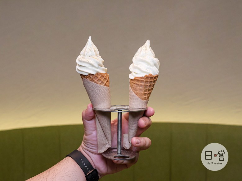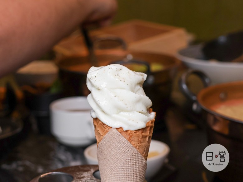 火鍋套餐的最後會有支褐藻鮮奶霜淇淋,在冰淇淋上可以看到褐藻的顆粒,鹹鹹甜甜的讓剛吃完火鍋的我們多充滿奶香但又爽口的冰淇淋做為完美結尾