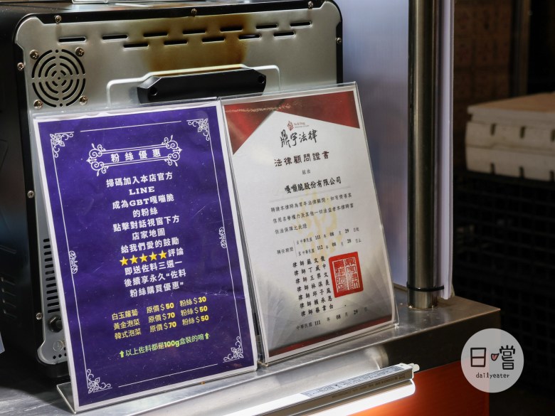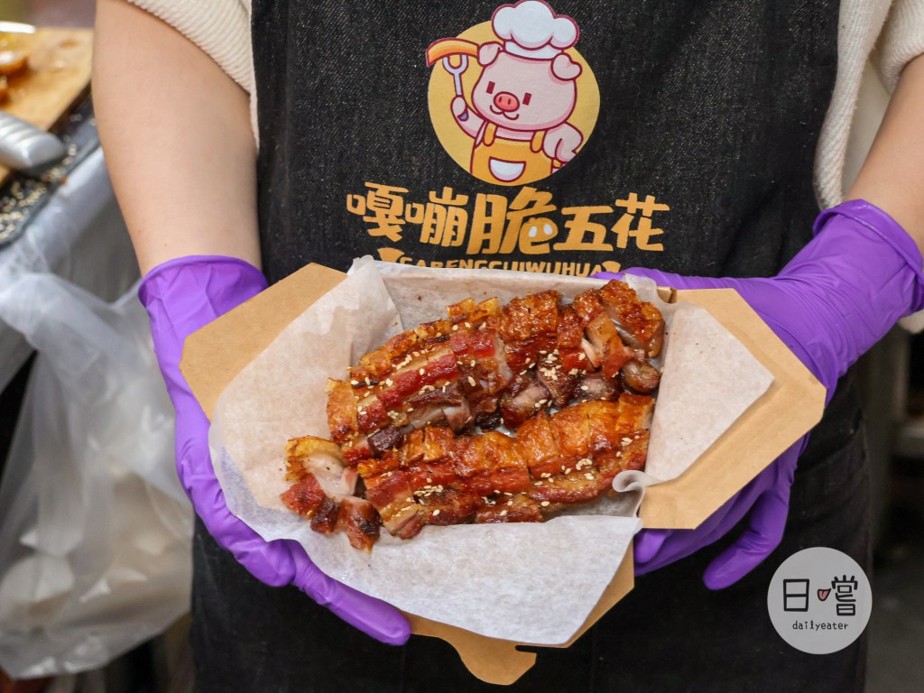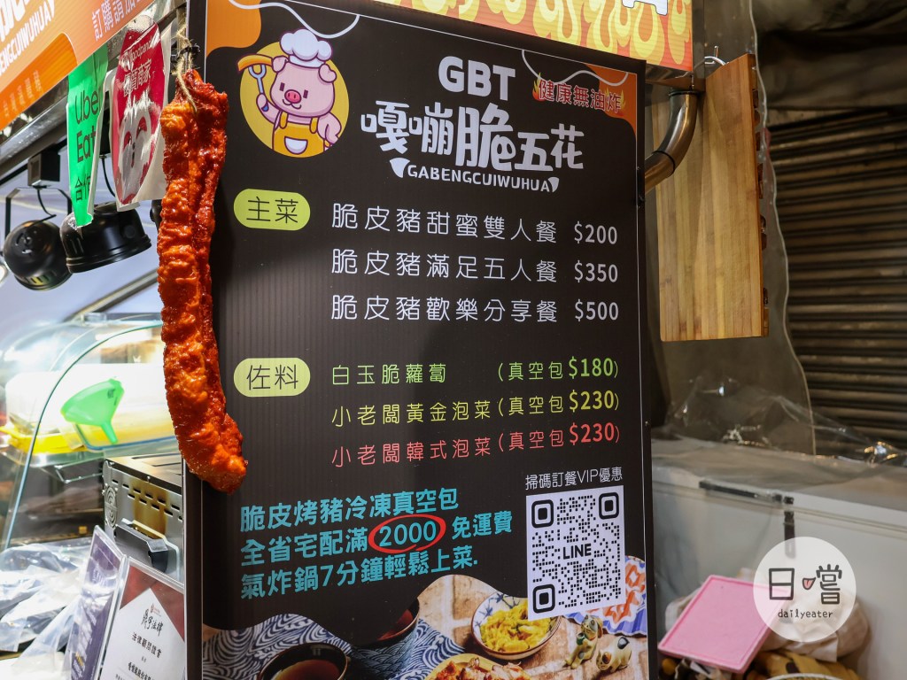 走進去和平黃昏市場內就可以看到有個特別明亮的攤位就是GBT嘎嘣脆五花的位置!一靠近就可以看到有塊金黃色的脆皮豬五花模型太誘人😋而在店面前就有律師保證的證書,所以對於GBT嘎嘣脆五花的品質可以說是絕對安心