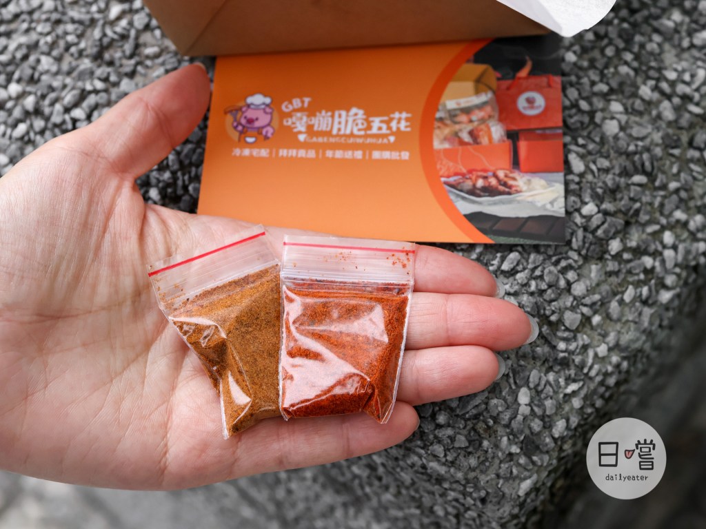不管是購買哪一種套餐,都會附上孜然風味粉跟四川麻辣粉兩種粉包,可以灑在脆皮豬上更增風味😍