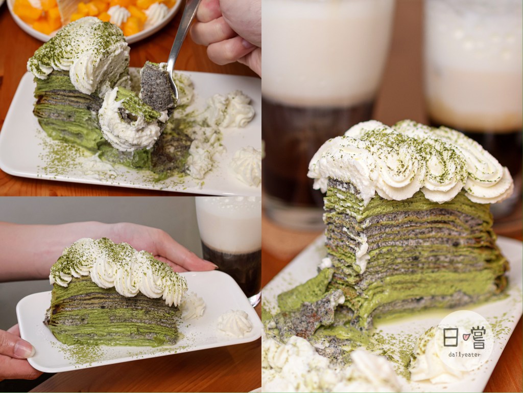 抹茶跟芝麻的組合完美的平衡了苦跟甜的味道,口味上可以說是非常有層次🤤吃起來芝麻的香氣比抹茶還要更明顯,綠色抹茶跟黑色芝麻交錯而成的千層也給人滿滿的視覺饗宴
