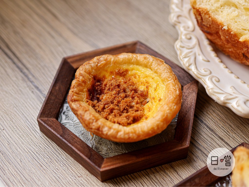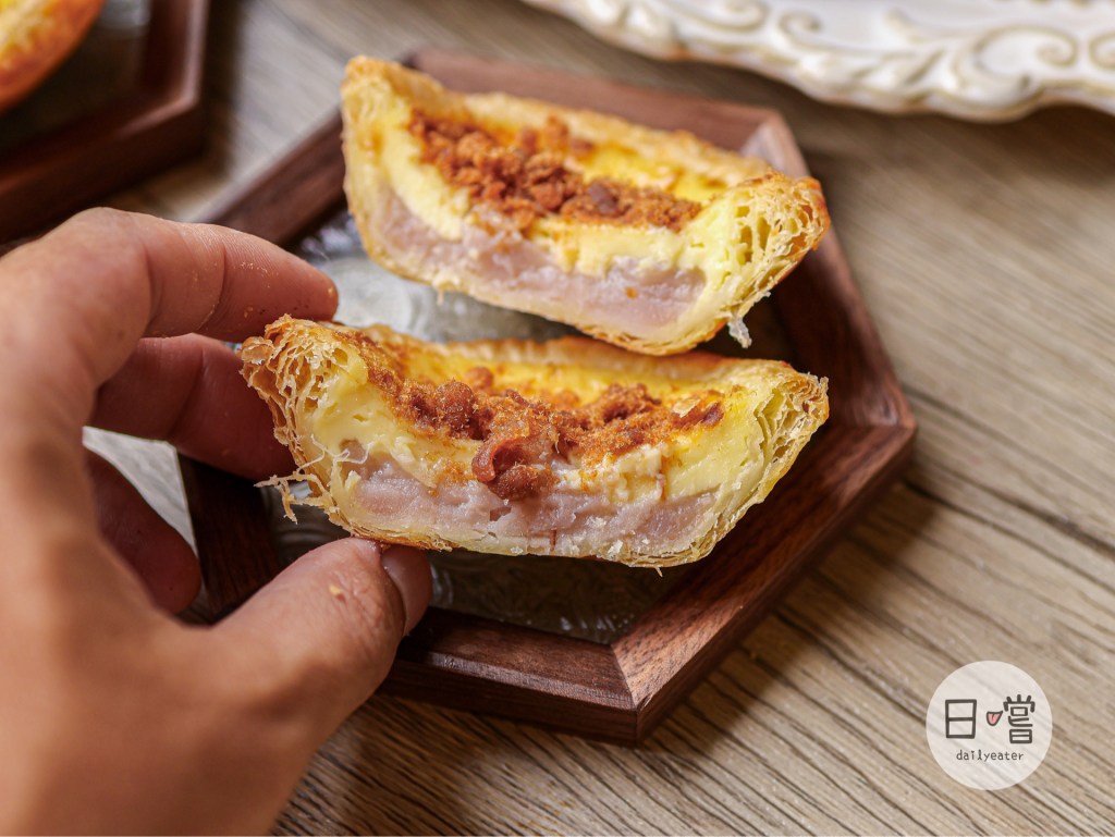 酥酥的外皮上肉鬆光用肉眼看就知道是真材實料的,切開可以看到層層分明的蛋塔皮、芋泥、蛋塔餡跟肉鬆🤤