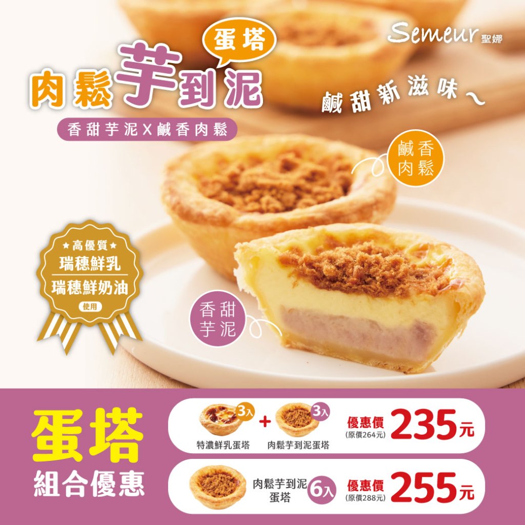 ✏️特濃鮮乳蛋塔3入+肉鬆芋到泥蛋塔3入:優惠價235元(原價264元)